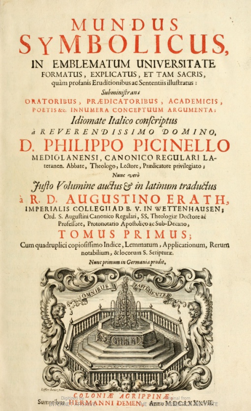 Mundus symbolicus, in emblematum universitate formatus, explicatus, et tam sacris, quàm profanis eruditionibus ac sententiis illustratus : subministrans oratoribus, praedicatoribus, academicis, poetis &c. innumera conceptuum argumenta / idiomate italico conscriptus à Reverendissimo Domino, Philippo Picinello ... ; nunc verò justo volumine auctus & in latinum traductus à R.D. Augustino Erath ...